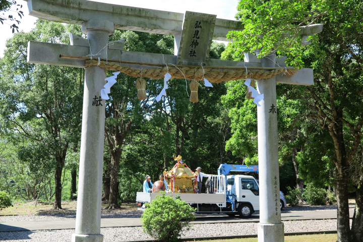 各地区的神社之神将从大月町的中央广美地区的9个地区聚集!可以说,这是一座位于广见地区山顶的神社。祭典当天,原始神社旗帜排列整齐的景象十分壮观。