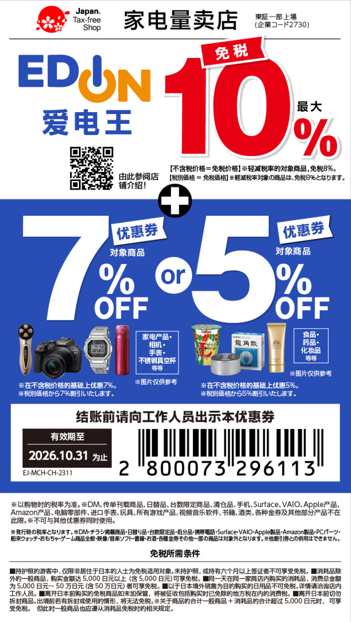 消耗品除外的一般商品,購買金額達5,000日圓(含5,000日圓)以上可享免稅。