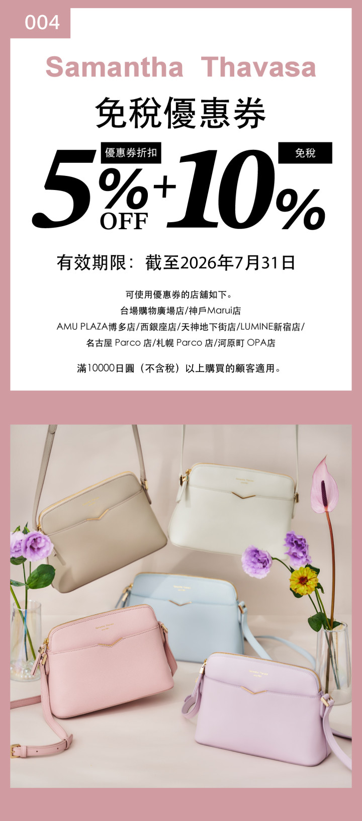 Samantha Thavasa优惠券: 5%折扣 + 10%免税