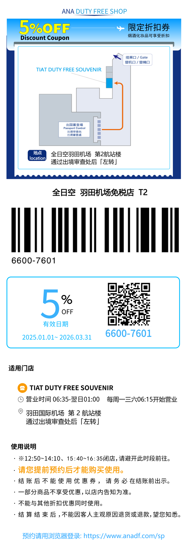 全日空 羽田机场T2免税店 提前预约5%折扣券