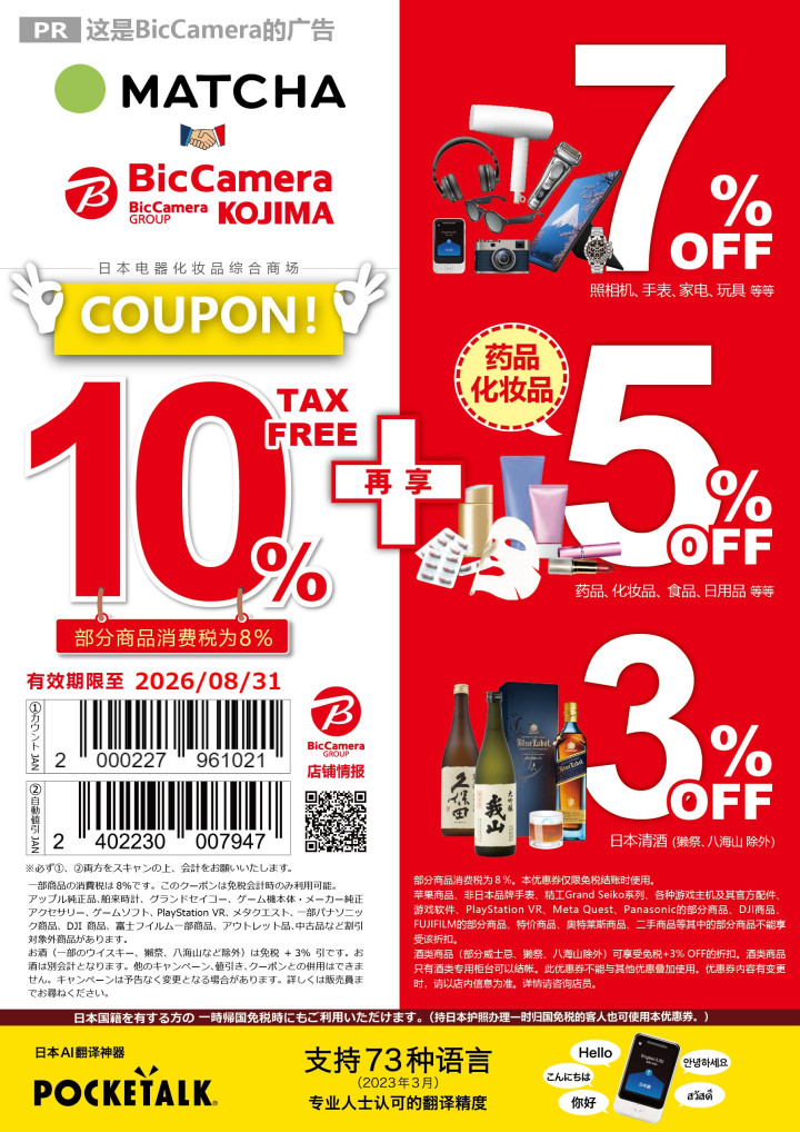 部分商品消费税为8%。本优惠券仅限免税结账时使用。