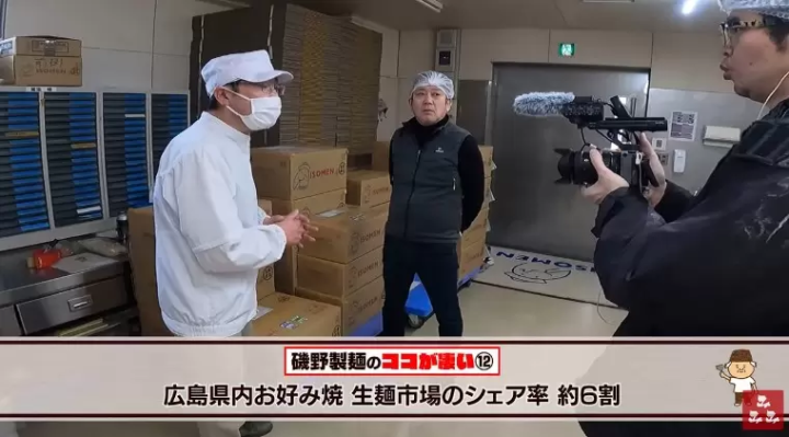 Isono Seimen Co., Ltd. was founded in 1962 as a noodle company that produces noodles specifically for Hiroshima's okonomiyaki. The first president, who was originally a rice milling company, began making fresh noodles specifically for okonomiyaki after being asked by the food stall owners he frequented if he could make noodles to put in okonomiyaki. The factory is open all year round, and produces 14,000 servings of noodles every day.