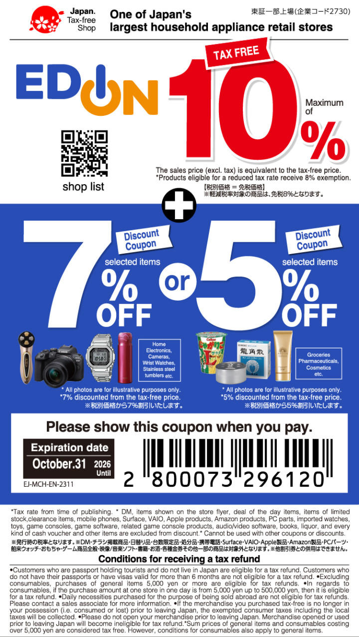 Please show this coupon when you pay. Cannot be used with other coupons or discounts. Customers who are passport holding tourists and do not live in Japan are eligible for a tax refund. Customers who do not have their passports or have visas valid for more than 6 months are not eligible for a tax refund.