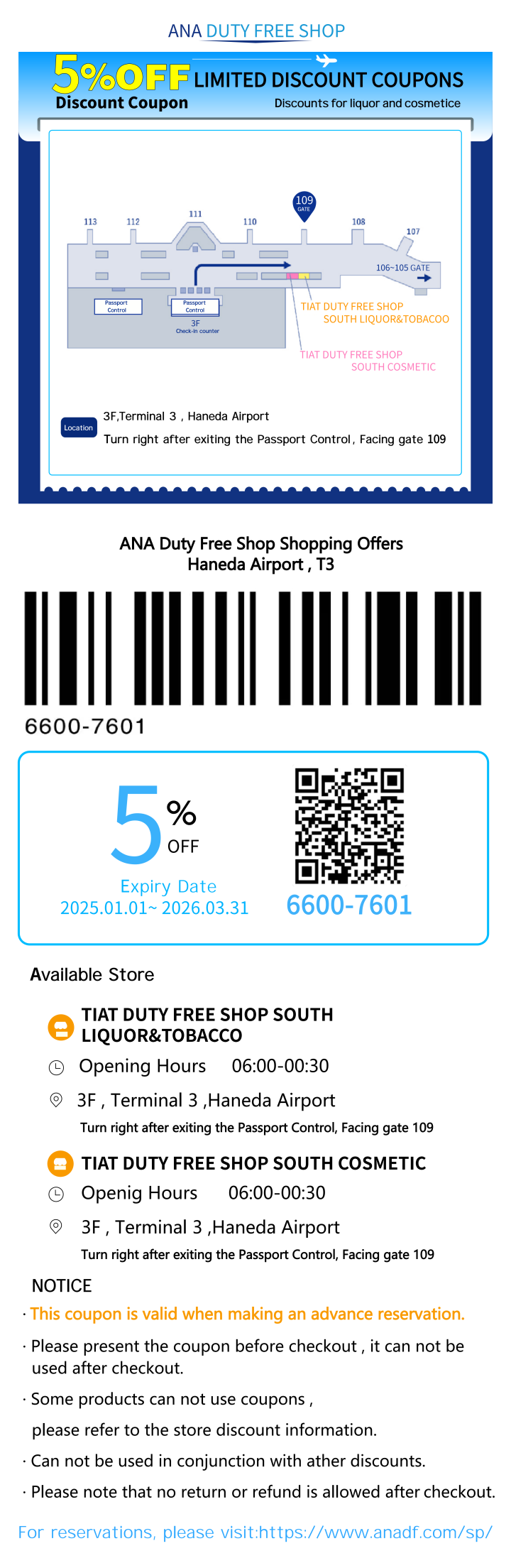 ANA DUTY FREE SHOP Haneda Airport T3 - 5% OFF Discount Coupon for Advance Reservation