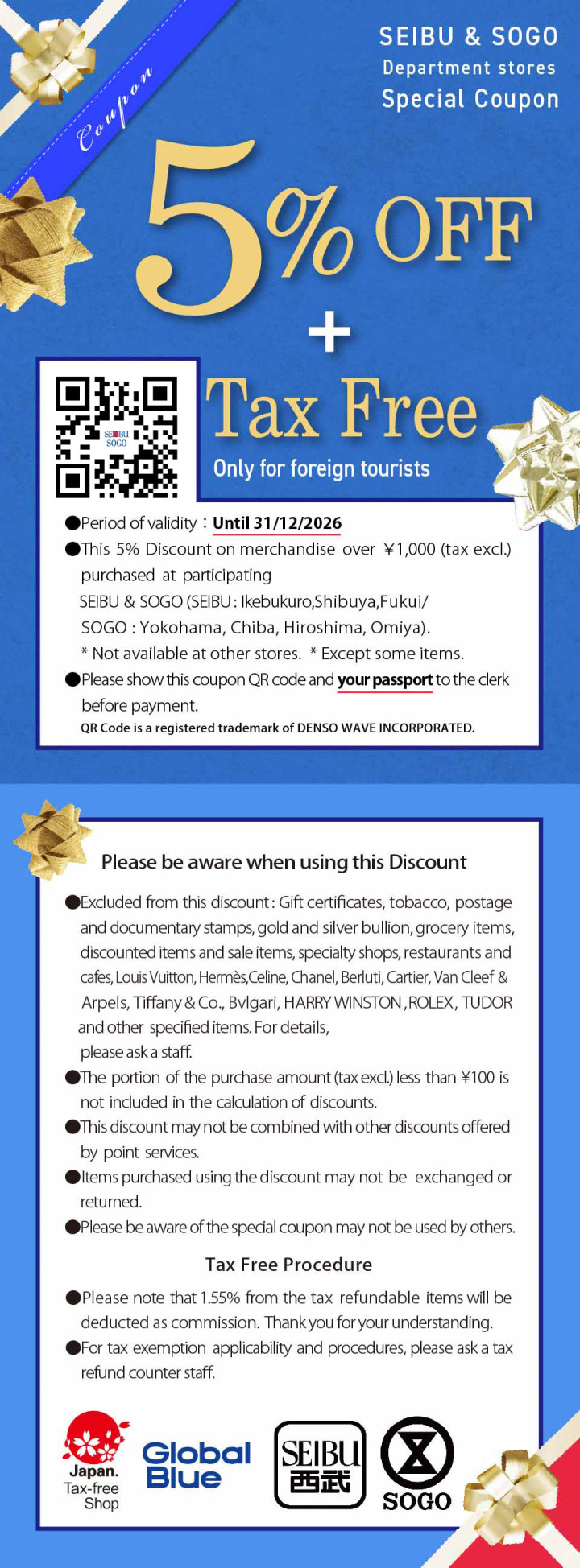 Receive a 5% discount (95% off) when you spend JPY 1,000 (excluding tax) or more at the designated Seibu Sogo department stores in Japan (Seibu: Ikebukuro Main Store, Shibuya Store, Fukui Store / Sogo: Yokohama Store, Chiba Store, Hiroshima Store, Omiya Store). *Not valid at other stores. *Excludes some merchandise.