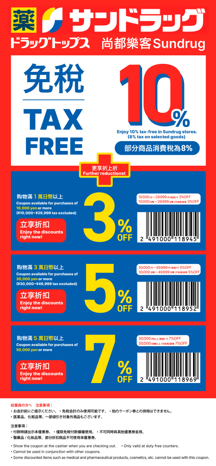 - For purchases of 50,000 yen or more (including tax), enjoy a 10% tax exemption + a 7% discount with the coupon.