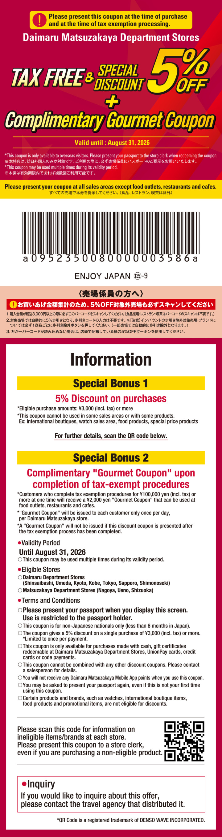 Daimaru Matsuzakaya Department Stores SHOPPING SUPPORT TICKET+Complimentary Gourmet Ticket