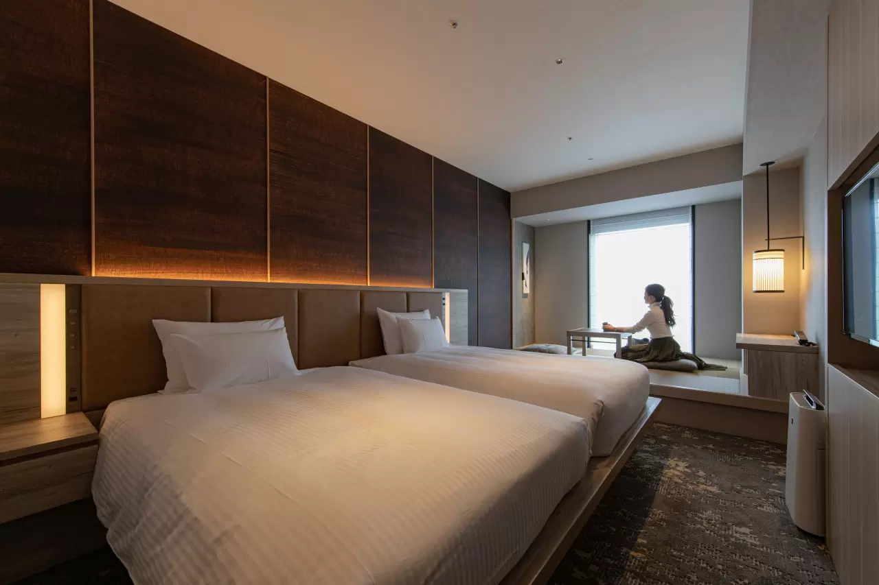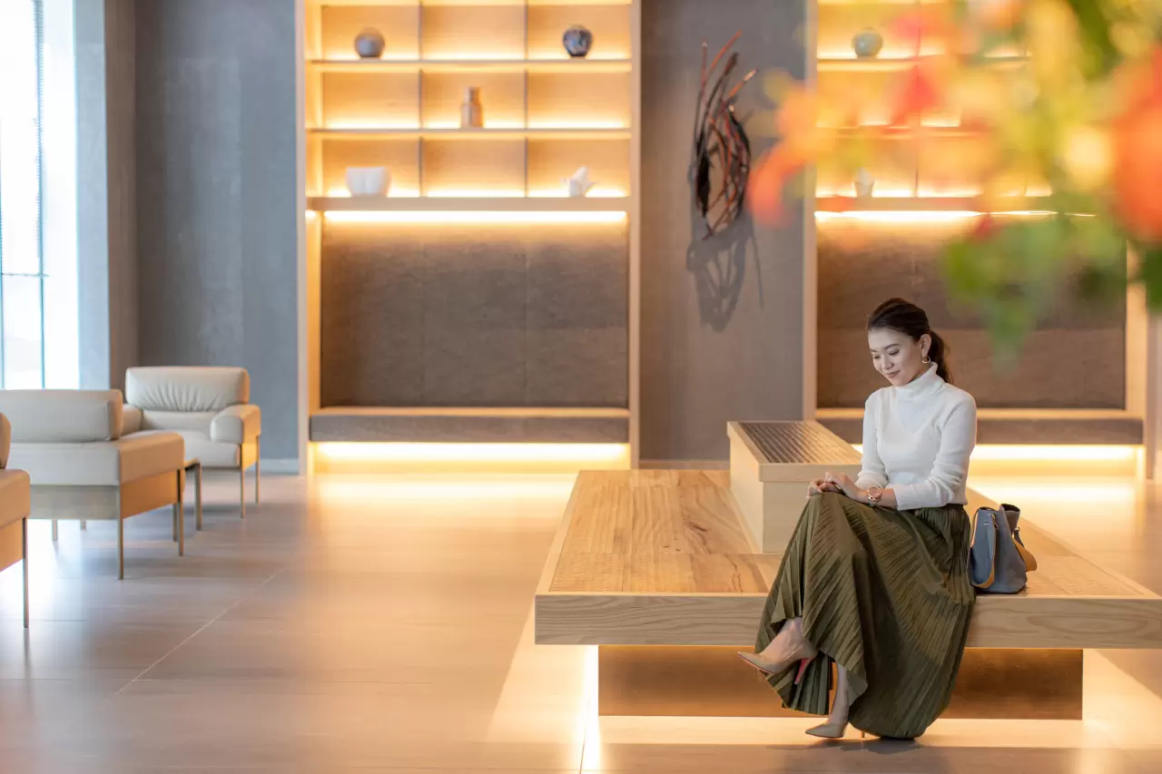 The hotel is within walking distance of historic temples and shrines, as well as the lively Nakasu and Kawabata areas, and the second floor is lined with popular local restaurants and cafes. The hotel is characterized by its interior and exterior designs that are based on Hakata-ori and Hakata-bei motifs, as well as the impressive Japanese atmosphere of the lobby and guest rooms, all of which are representative of the "coolness of Hakata." There are also plenty of additional facilities, including a large communal bath with sauna and a fitness room. The top club floor has 13 special rooms and a lounge called "HAKATA LOUNGE" exclusively for guests staying on this floor. Enjoy a special Japanese and Western-style breakfast buffet that incorporates plenty of Kyushu ingredients.