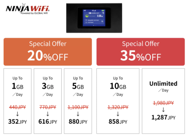Temukan pocket Wi-Fi hemat budget terbaik untuk perjalanan di Jepang—untuk keluarga, kelompok, dan bisnis. Termasuk kupon diskon: 35% untuk NINJA WiFi dan lainnya.