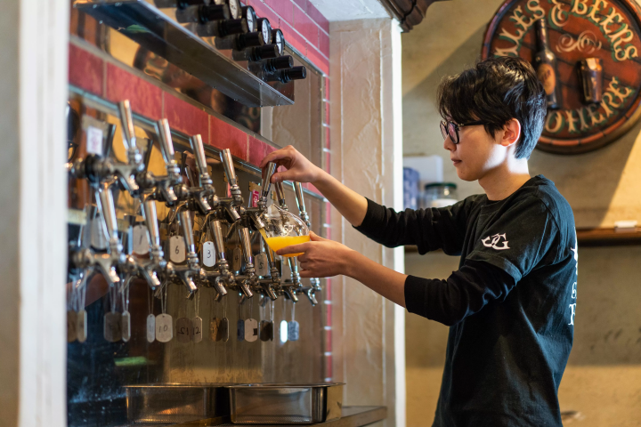 瓶ビールを購入することもできますが、アンティークが立ち並ぶ店内で出来立てのビールを楽しむこともできます。