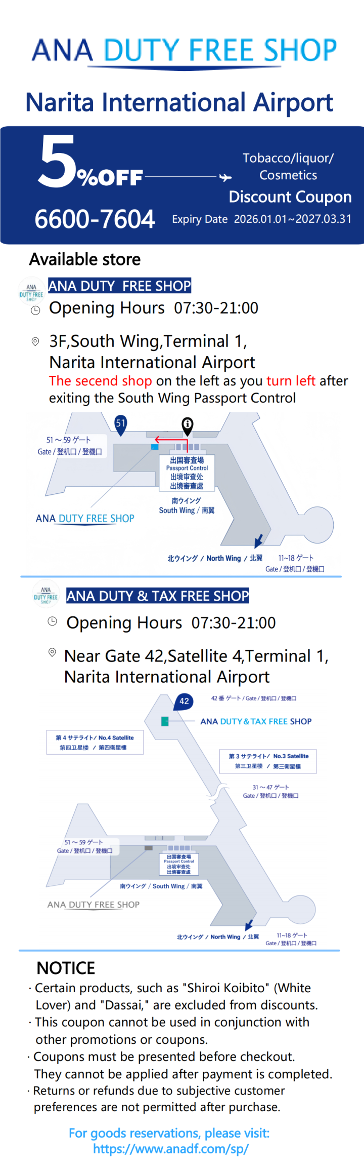 ANA DUTY FREE SHOP 成田空港ターミナル1- 免税商品事前予約5% OFFクーポン