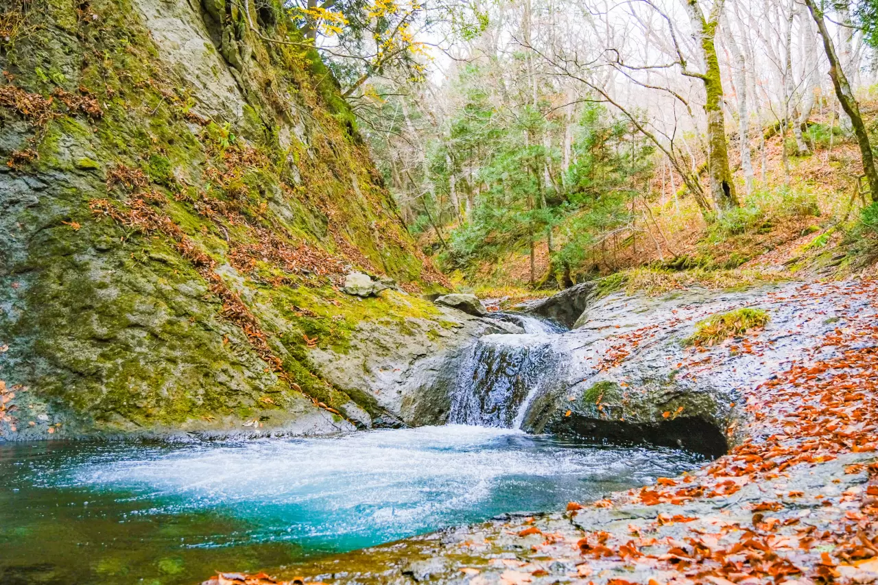 エメラルドグリーンに透き通った水流が、目の前で見られるスポット。二俣川の目の前まで降りるため、履き慣れた靴での散策がベストです。