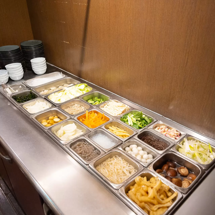 각 코스에는 20종류 이상의 냄비 야채, 우동과 밥의 뷔페가 붙어 있습니다.