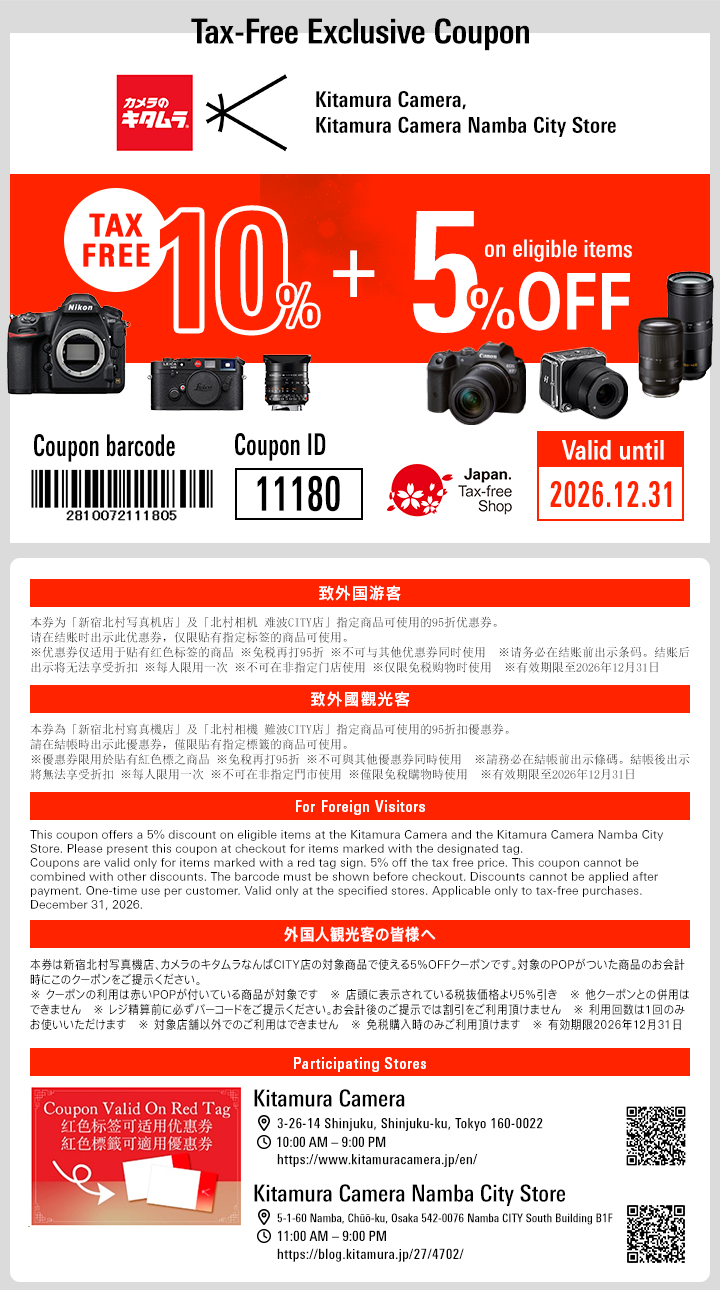 이 쿠폰은 신주쿠 키타무라 사진기점, 카메라노 키타무라 난바 CITY점의 대상 상품에 사용할 수 있는 5% 할인 쿠폰입니다.