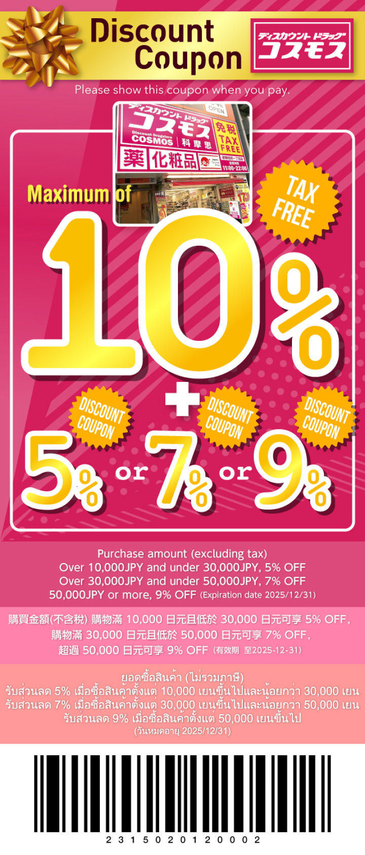 - 50,000엔 이상: 9% 할인 + 10% Tax Free