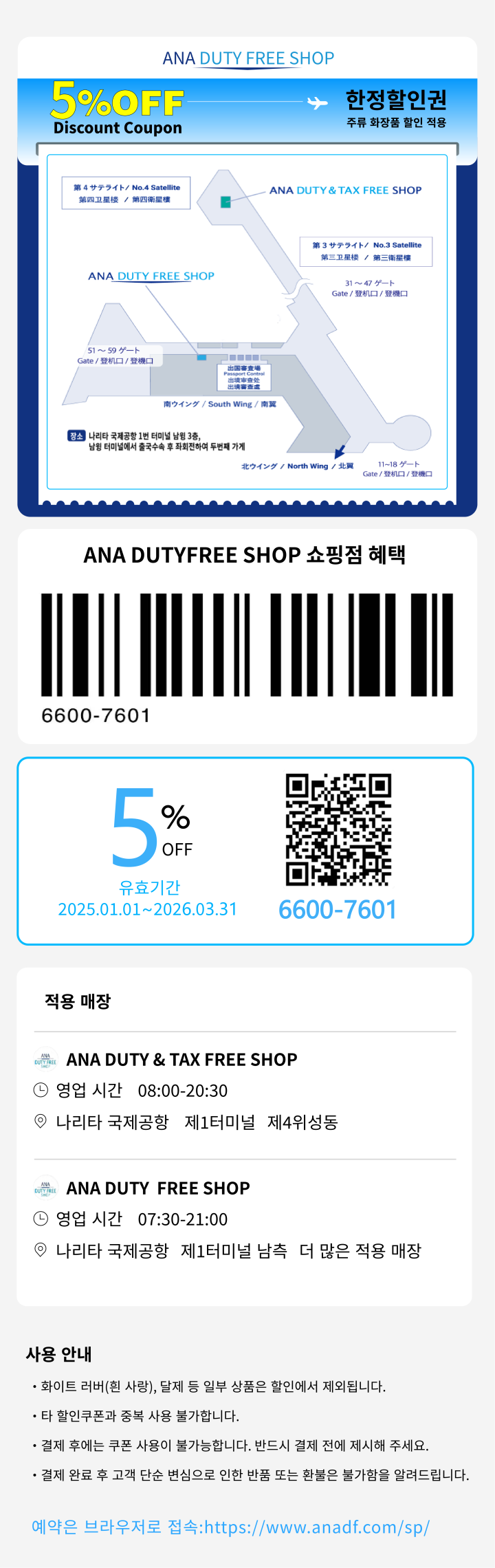 ANA DUTY FREE SHOP 나리타 국제공항 제1터미널 - 사전 예약 5% 할인 쿠폰