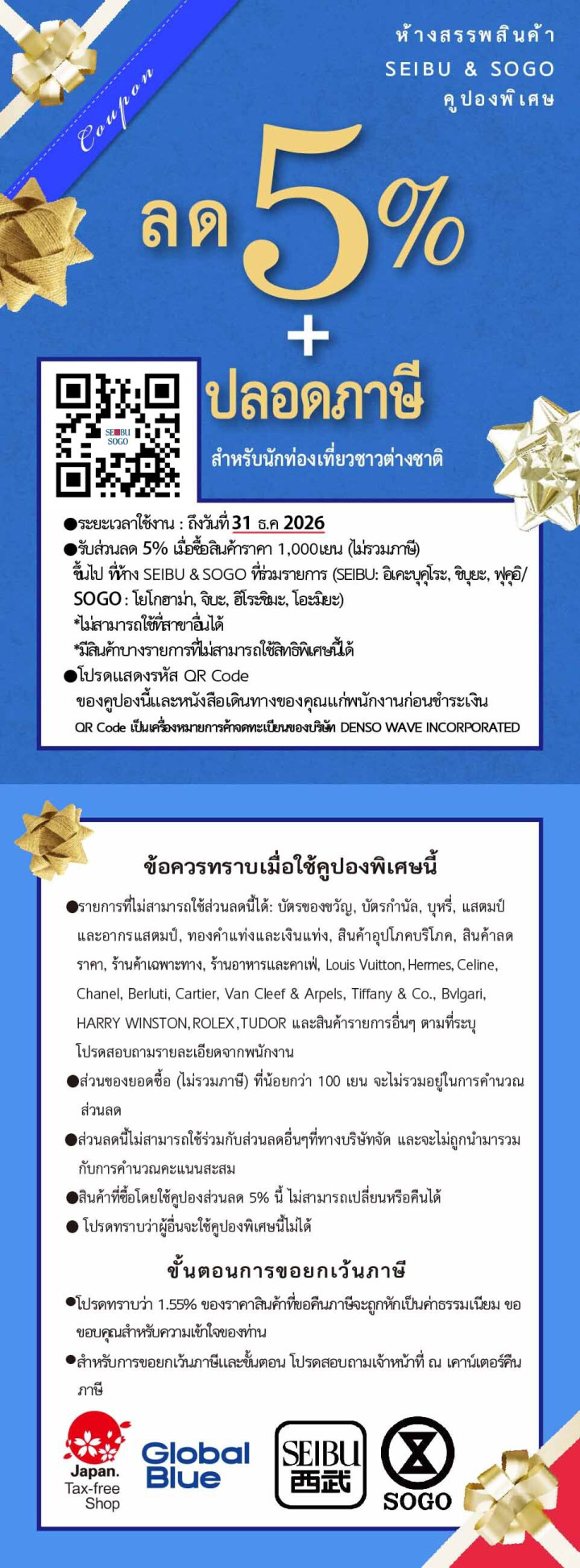 รับส่วนลด 5% (ลด 95%) เมื่อซื้อสินค้าครบ 1,000 เยน (ไม่รวมภาษี) ขึ้นไป ที่ห้างสรรพสินค้า Seibu Sogo สาขาที่กำหนดในประเทศญี่ปุ่น (Seibu: สาขาใหญ่ Ikebukuro, สาขา Shibuya, สาขา Fukui / Sogo: สาขา Yokohama, สาขา Chiba, สาขา Hiroshima, สาขา Omiya) *ไม่สามารถใช้ได้ที่ร้านค้าอื่น *ยกเว้นสินค้าบางรายการ