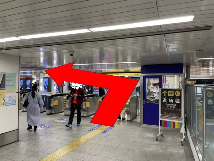抵達Osaka Metro禦堂筋線難波站後,請沿著指示牌(㉑㉒㉖-㉜ JR線 ㉓㉔ 近鐵、阪神 ⑭-⑳、㉕)前往地下1層的難波站出口(東北檢票口)。您可以使用以下任意設施到達出口(東北檢票口):樓梯、自動扶梯或電梯。離開出口(東北檢票口)後立即左轉。
