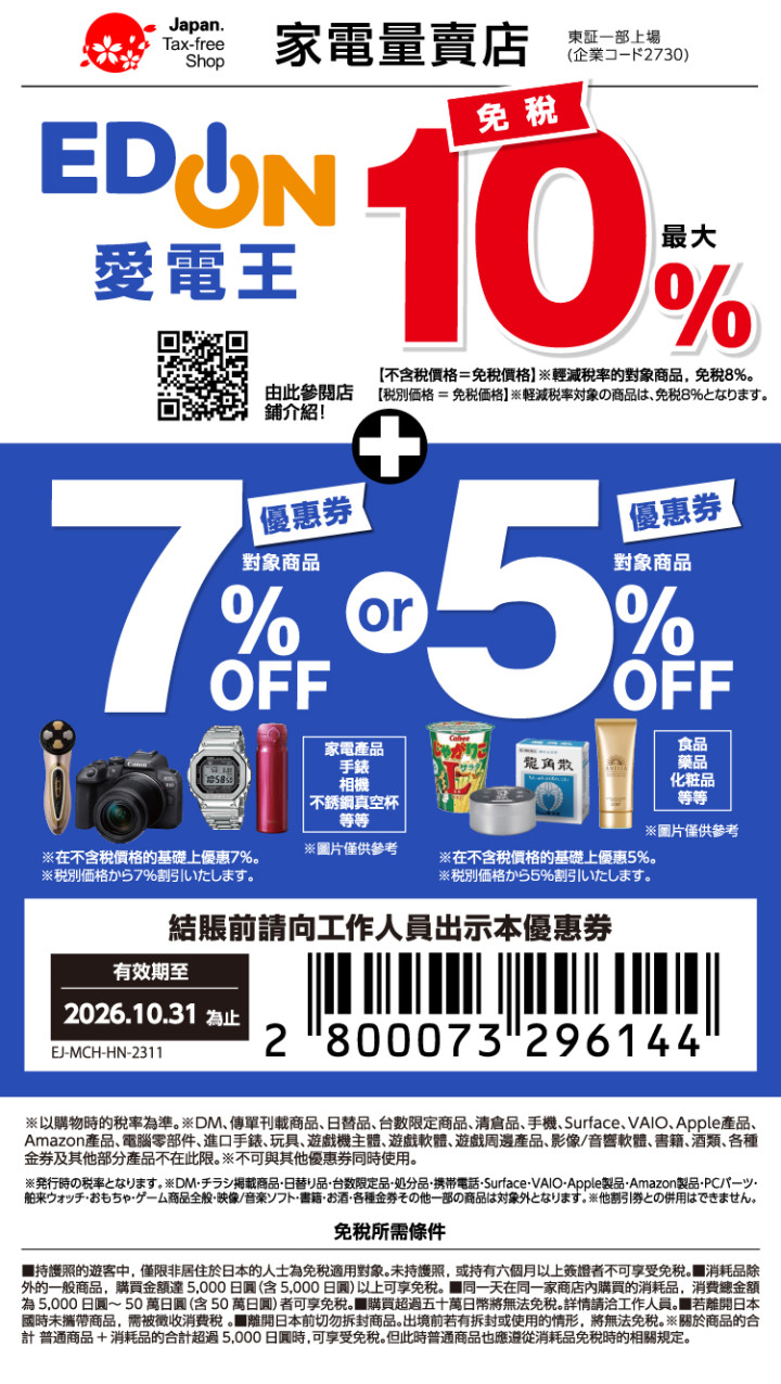 免稅最大 10%對象商品 7% 優惠券