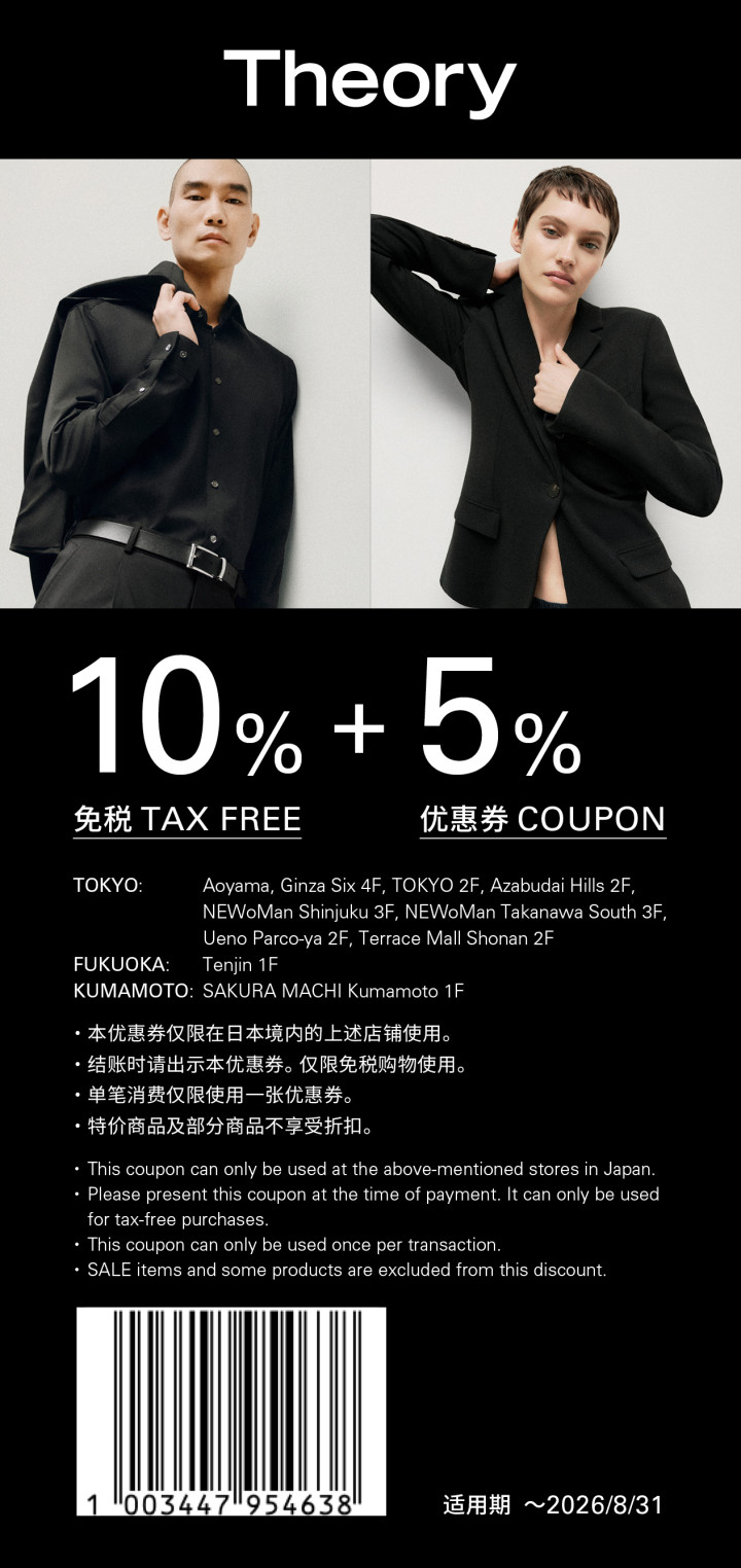 - 東京: Theory青山店, Theory東京店, 銀座SIX 4F, 麻布台Hills 2F, NEWoMan新宿 3F, NEWoMan高輪South 3F, 上野Parco_ya 2F
