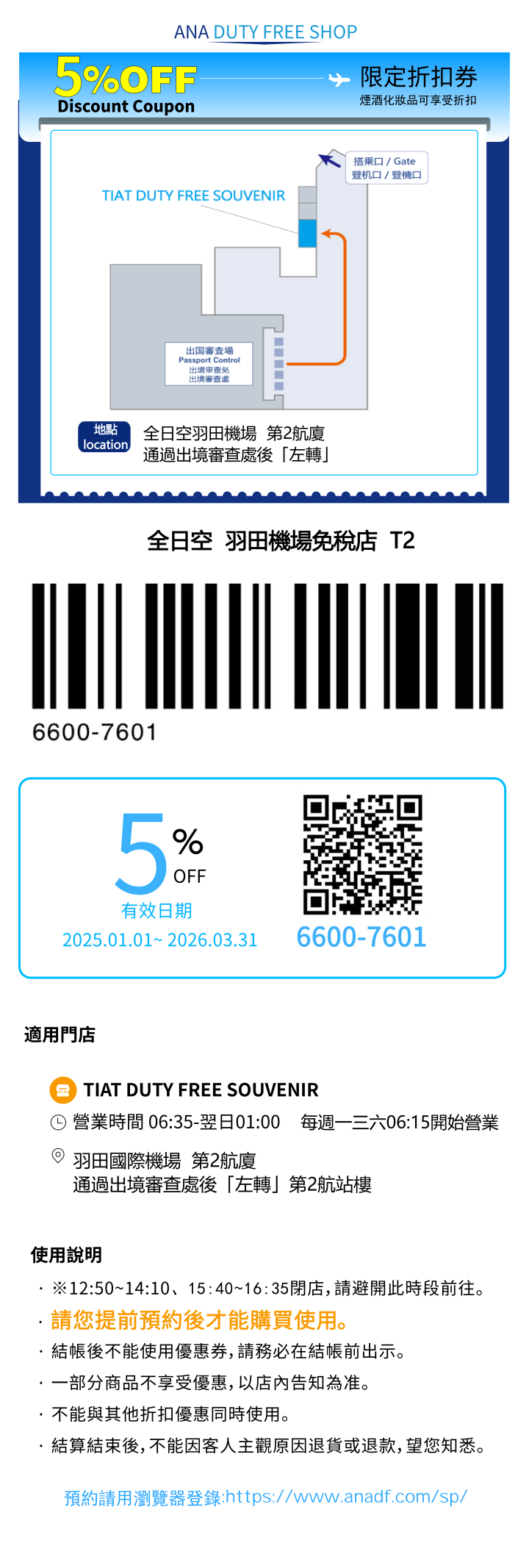 全日空 羽田機場T2免稅店 提前預約5%折扣券