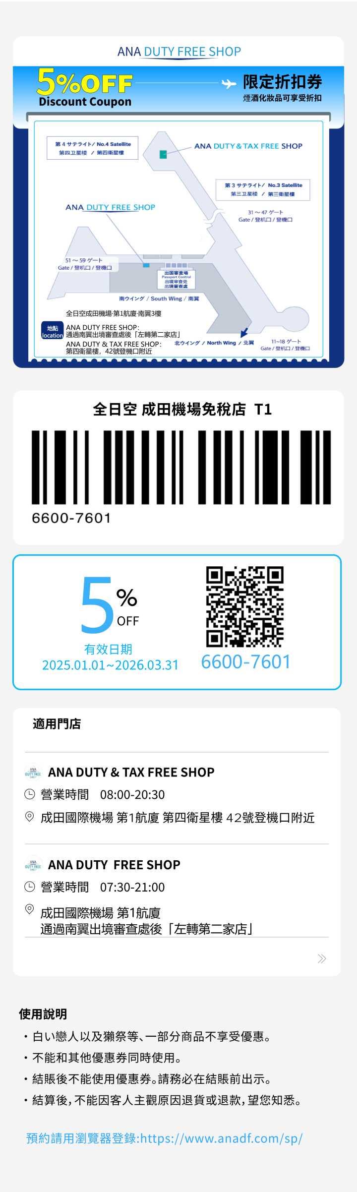 全日空 成田機場T1免稅店 提前預約5%折扣券