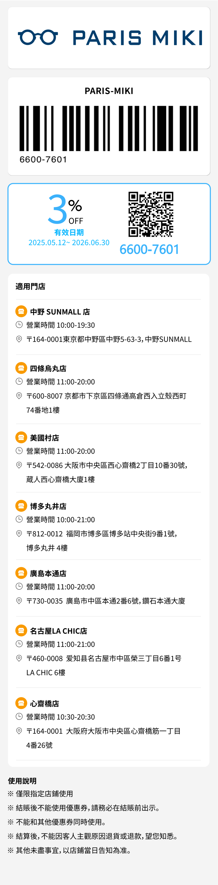 PARIS MIKI 巴黎三城 3%折扣優惠券